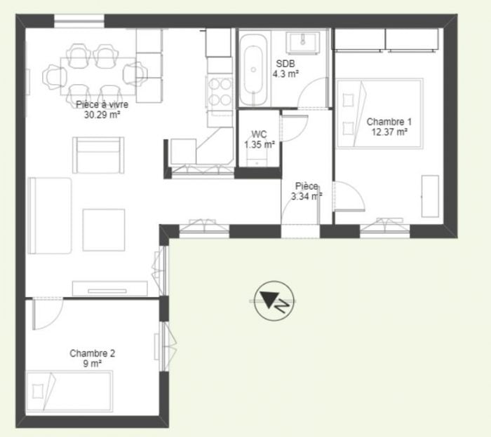 Comprenant entrée, séjour avec cuisine ouverte de 25m2, 2 chambres dont une avec rangement, salle de bains, wc séparés. Très belle terrasse en bois, coin jardin et stationnement pour 2 voitures.